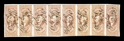 couple stamps, second stamp with tear at bottom, very fine appearance o#R49a, 25c Protest, imperforate, horizontal strip of eight, mostly large margins, just into design at bottom, 1863 ms. cancels, horizontal crease causes paper splitting in a couple stamps, second stamp with tear at bottom, very fine appearance; only one larger multiple exists (see the next lot). (Image) $800.00+