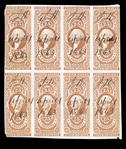 second stamp at top with small pinhole from cancel, fine appearance.#R49a, 25c Protest, imperforate, block of eight (4x2), being the second largest multiple known (see next lot for largest), rich color, 1863 ms. cancels, some creasing as usual, second stamp at top with small pinhole from cancel, fine appearance. (Image) $1,500.00