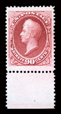 incredibly well centered within the most massive jumbo margins imagina#166, 90c Rose carmine, a sensational bottom sheet-margin mint example in a true "post office" fresh state, boasting absolutely remarkable physical attributes, including being incredibly well centered within the most massive jumbo margins imaginable, brilliantly fresh and crisp overall, with rich radiant color and impression on immaculate paper, even its reverse is sheer perfection, with unblemished o.g. that has never been hinged, superb.In the new "graded" world one would think that only stamps that have a high numeric grade assigned to them are desirable and realize the new dramatic eye-opening prices. However, there are some stamps that defy grading and are in a class by themselves. The phenomenal stamp offered here is one such stamp. It possesses margins of incredible size, which are wonderfully well balanced. But, beyond its centering and immense margins are all of the other incredible physical attributes that grading cannot adequately account for. Without fear of being contradicted, this is finest never hinged 1873 Ninety Cent Continental Bank Note in existence, graded or not.When this incomparable stamp last appeared on the auction market in Shreves March 2002 "Premier" Sale) it realized a record price. We fully anticipate that its reappearance on the market will again generate exceptional bidding excitement and another impressive realization. Accompanied by 1988 and 2002 PF certificates; ex-"Southern Cross", Higgins. (Image) for hinged $2,750.00