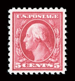 within uncharacteristically large margins, especially even and intact perf#467, 5c Carmine error, a highly select mint single of this popular error, brilliantly fresh and crisp, with truly radiant color on immaculate paper, outstanding centering within uncharacteristically large margins, especially even and intact perforations, o.g., n.h., extremely fine; a pristine gem; 1999 PF certificate for a strip of three from which this stamp was taken; ex-Vreeland. (Image) $1,100.00