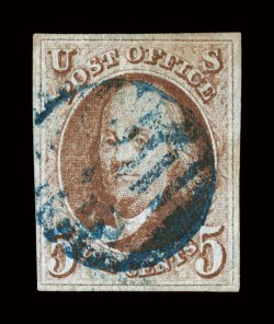 handsome.#1, 5c Red brown, premium quality used single, four large even margins, bright color and a fine impression, cancelled solely by a light blue town postmark, extremely fine and handsome. (Image) $635.00