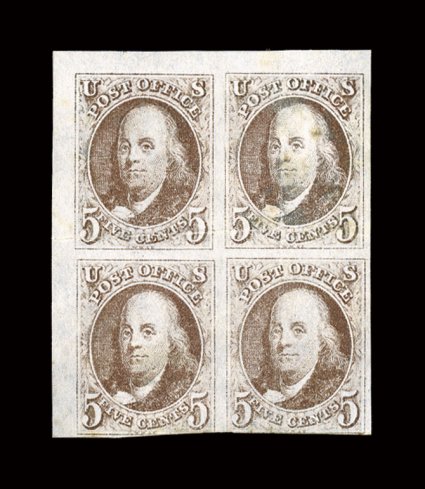 crease affects the top two stamps, light vertical crease in right pai#1, 5c Red brown, a very rare unused top left corner sheet-margin block of four, right margin large, into the frame line at bottom, rich color and a fine impression, horizontal crease affects the top two stamps, light vertical crease in right pair, lightly cleaned causing slight discoloration to the top right stamp, despite the flaws this is a rather handsome block of very fine appearance; 1967 PF certificate for the original block of six from which this came. (Image) $42,500.00