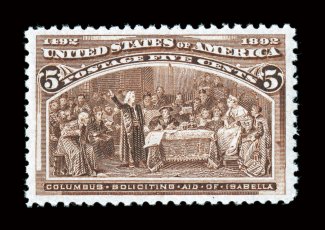 certificate.#234, 5c Columbian, exceptionally well centered amid large margins, deep luxuriant color, crisp detailed impression, o.g., n.h., extremely fine; 2005 PF certificate. (Image) $260.00