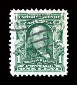 1296 Ou 300 300, 1c Blue green, striking used single, extraordinarily well centered within lavishly large margins all around, bright color, lightly cancelled, extremely fine used gem 2008