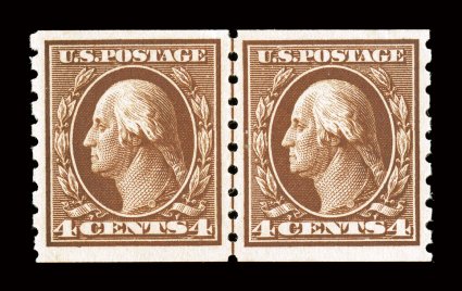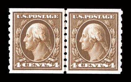 a 2008 PSE certificate (both graded XF 90 SMQ $620.00).#395, 4c Brown coil, perf. 8 1/2 vert., guide line pair, especially well centered, strong color and impression, o.g., very lightly hinged, extremely fine; 2005 PF certificate and a 2008 PSE certificate (both graded XF 90; SMQ $620.00). (Image) $475.00