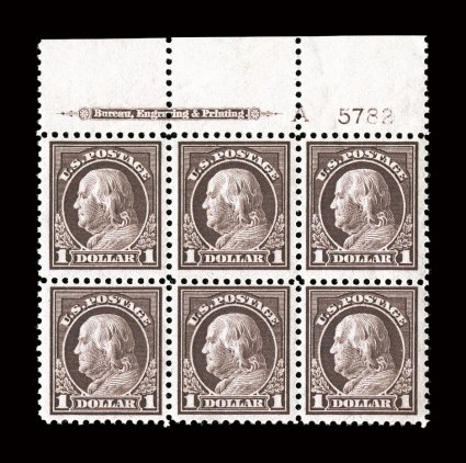 fine.#518, $1.00 Violet brown, full top margin imprint and plate no. 5782 block of six, strong color, o.g., lightly hinged, flat plate gum bends and skips, fine-very fine. (Image) $1,300.00