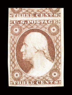 portion of the stamp at left, lovely color and crisp impression in a pale#11 var., 3c Brownish carmine, position 96L7, impressive large bottom sheet-margin single, possessing unusually large margins on the other three sides, including showing a portion of the stamp at left, lovely color and crisp impression in a pale brownish carmine shade of 1856, light portion of a black c.d.s. that leaves the face free of cancel, extremely fine gem, ex-Amonette. (Image) $18.00