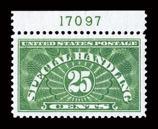1705 nhu QE4a QE4a, 25c Yellow green Special Handling, top margin plate no. 17097 single, beautifully centered within very large margins, wonderfully bright and fresh, o.g., n.h., extremely