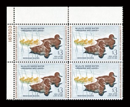 1713 nhPB RW27 RW27, 1960 $3.00 Multicolored, top left corner plate no. 167503 block of four, exceedingly well centered, fresh colors, o.g., n.h., extremely fine.#RW27, 1960 $3.00 Multicolored, top left corner plate no. 167503 block of four, exceedingly well centered, fresh colors, o.g., n.h., extremely fine. (Image) $450.00