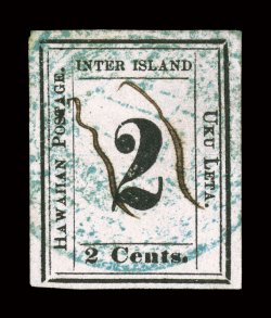 fine.#16, 2c Black on grayish, Plate 3-E, Type X (position 10), four large margins, strong color, ms. and light blue handstamp cancels, light horizontal crease, otherwise very fine. (Image) $800.00