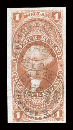 handsome double circle handstamp cancels dated July 19, 1865, extreme#R68a, $1.00 Foreign Exchange, imperforate, impressive used single, with large to huge margins all around, strong color and impression on especially fresh paper, two strikes of handsome double circle handstamp cancels dated July 19, 1865, extremely fine; 2005 PF certificate. (Image) $80.00
