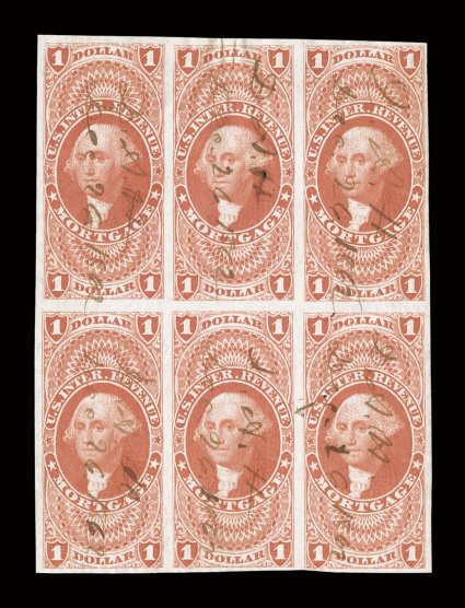 middle stamp with other small faults, very fine appearance.#R73a, $1.00 Mortgage, imperforate, block of six (3x2), full to large margins all around, strong rich color, 1862 ms. cancels, vertical crease through the middle stamps, to middle stamp with other small faults, very fine appearance. (Image) $685.00