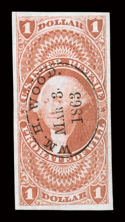 especially bright paper, lovely central strike of a Wm. H. Wood.Mar 3,#R76a, $1.00 Probate of Will, imperforate, a superb used example of this value, with four wide and perfectly balanced margins, plus its color and impression are prooflike on especially bright paper, lovely central strike of a "Wm. H. Wood./Mar 3, 1863" oval handstamp cancel, extremely fine gem; a gorgeous stamp for the finest quality collection; 2005 PF certificate. (Image) $90.00