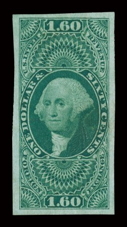 horizontal crease and a couple tiny thin specks, very fine appear#R79a, $1.60 Foreign Exchange, imperforate, full to mostly large margins all around, strong rich color, nicely cancelled by a light blue 1863 c.d.s. of J.P. Morgan & Co., faint horizontal crease and a couple tiny thin specks, very fine appearance; 1993 PF certificate. (Image) $1,300.00