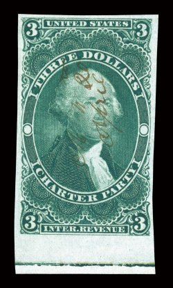 prooflike color and impression on particularly bright paper, neat manuscript#R85a, $3.00 Charter Party, imperforate, an especially handsome and choice used example, with four large to huge margins, including a full sheet margin at bottom, truly prooflike color and impression on particularly bright paper, neat manuscript cancel, extremely fine. (Image) $175.00