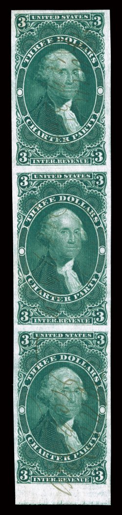 impression, light ms. cancels, faint horizontal creases between stamps, top s#R85a, $3.00 Charter Party, imperforate, a most impressive bottom sheet-margin vertical strip of three, other margins also large, deep luxuriant color and a razor-sharp impression, light ms. cancels, faint horizontal creases between stamps, top stamp with trivial wrinkle, tiny scissor cut in bottom margin, otherwise extremely fine. (Image) $575.00