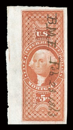 B.M.E. Feb. 23, 1863 manuscript cancel, extremely fine gem a superb#R91a, $5.00 Mortgage, imperforate, a fabulous used example, boasting absolutely enormous margins all around, including a full sheet margin at left, rich luxuriant color, neat "B.M.E. Feb. 23, 1863" manuscript cancel, extremely fine gem; a superb stamp; 2003 PF certificate; ex-Buford, Kingsley. (Image) $175.00