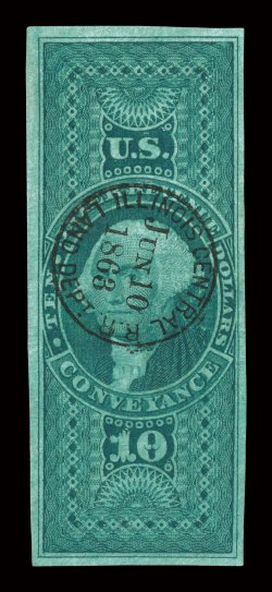 strike of an Illinois Central R.R.Jun 10, 1863Land Dept. railroad#R94a, $10.00 Conveyance, imperforate, used, four large to very large margins, deep intense color and a well defined impression, beautifully cancelled with a perfect central strike of an "Illinois Central R.R./Jun 10, 1863/Land Dept." railroad handstamp, extremely fine gem; a beautiful used example; 2004 PF certificate. (Image) $125.00