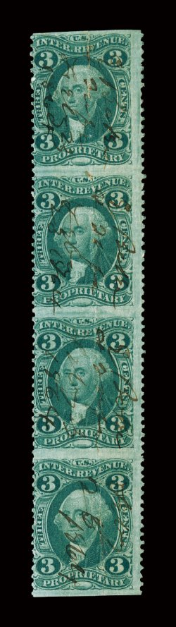 multiple is recorded ex-Judge Fay.#R18b, 3c Proprietary, part perforate, vertical strip of four, rich color, neat 1864 ms. cancels, horizontal crease causes some paper splitting, fine appearance; only one larger multiple is recorded; ex-Judge Fay. (Image) $2,200.00+