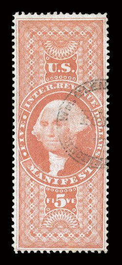 handstamp cancel, very fine and exceptionally choice.#R90c, $5.00 Manifest, premium quality used example, particularly well centered within uncharacteristically large margins, bright color, portion of lightly struck circular handstamp cancel, very fine and exceptionally choice. (Image) $90.00