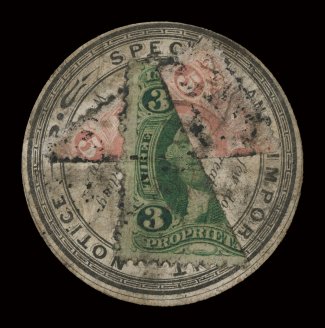 stamps used to form a tete-beche single on piece of document, and a 15c InFirst issue unusual trio, with a bisect of both the 3c and 5c Proprietary used to pay the 4c tax on a bottle cap (probably perfume), 2c U.S.I.R. bisects of two different stamps used to form a "tete-beche" single on piece of document, and a 15c Inland Exchange with strong offset on back, interestingly, the offset shows a dramatic paper fold, mixed condition. (imagea) (imageb) (Image) Est. $150-200