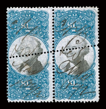 the largest known multiple of this stamp, being one of only four (al#R122, $1.90 Blue and black, horizontal pair, bright colors, 1872 ms. cancels, extra horizontal perforation through the stamps (probably made at a later time), fine; a pair is the largest known multiple of this stamp, being one of only four (all horizontal) in the Curtis census. (Image) $850.00