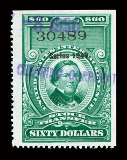 violet handstamp as well as possessing an unusually light and unobtrusi#RD138, $500.00 Bright green, Series 1942, an exceptional used example of this immense stock transfer stamp rarity, with strong bright color, exceedingly well centered, light violet handstamp as well as possessing an unusually light and unobtrusive perforated initials cancel, extremely fine; it is believed that no more than five or six examples exist, making this one of the keys to completing the "dated" stock transfer series. (Image) $8,000.00