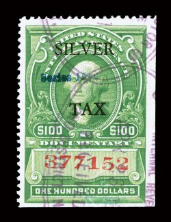 cancels, accompanying certificate mentions a small surface scrape a#RG57, $100.00 Green, "Series 1940", a well centered used example of this Silver Tax rarity, featuring strong rich color on bright fresh paper, neat violet double oval handstamp cancels, accompanying certificate mentions a "small surface scrape at bottom" which is barely discernible and of little importance on such an infrequently offered stamp, still very fine; 1985 PF certificate; ex-Handy. (Image) $5,000.00