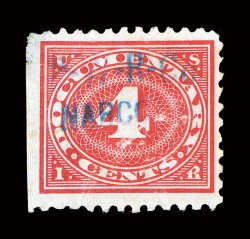 strong color, better centering than typically found, certificate ment#RJA26, 1c Carmine rose, with "Narcotic/E.L. Co./3-19-19" overprint, a handsome example of this exceedingly rare stamp which was overprinted by Eli Lilly Co. for their own use, strong color, better centering than typically found, certificate mentions a thin speck which is microscopic, very fine; only a very small number are known; 2001 PSE certificate. (Image) $2,600.00