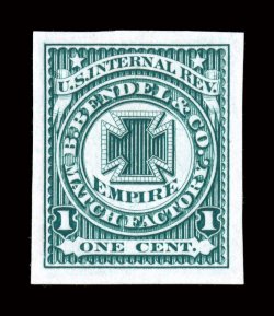 extremely fine.#RO24TC1, B. Bendel & Co., 1c Green, trial color die proof on India, a desirable proof possessing large margins all around, brilliant green color and detailed impression, extremely fine. (Image) $500.00