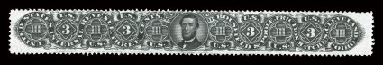 variety, crisp color and impression, very fine.#RO49di, Byam, Carlton & Co., 1c Black, watermarked, imperforate horizontally, block of four, an unusually well centered example of this terribly underrated and undercataloged variety, crisp color and impression, very fine. (Image) $250.00