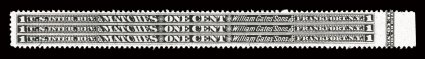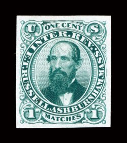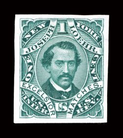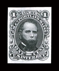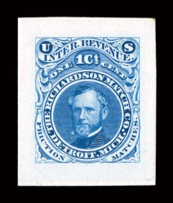 fine.#RO146P1 var., P. M. Co., 1c Black, die proof on India, double transfer, full to large margins, fresh color, showing a doubling of "Matches." label, very fine. (Image) $175.00