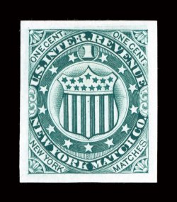 2111 TC RO136TC1 RO136T1, New York Match Co., 1c Green, trial color die proof on India, perfectly balanced large margins, detailed impression, very fine.#RO136T1, New York Match Co., 1c Green, trial color die proof on India, perfectly balanced large margins, detailed impression, very fine. (Image) $300.00