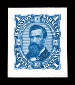 fine.#RO171TC1, H. Stanton, 1c Blue, trial color die proof on India, mounted on card, large balanced full size margins, striking intense color, card thins, extremely fine. (Image) $300.00