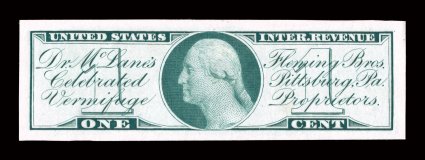appearance.#RS88TC1, Fleming Bros. Vermifuge, 1c Green, trial color die proof on India, large balanced margins, bright color and clean impression, small thins, very fine appearance. (Image) $500.00