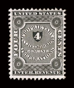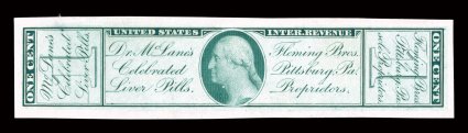 this seldom seen stamp, ex-Joyce.#RS90u, Fleming Bros. Liver Pills, 1c Ultra, old paper, single, two large margins, small tear at upper right, light vertical crease, fine appearance; a presentable example of this seldom seen stamp, ex-Joyce. (Image) $2,000.00
