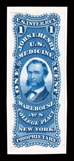 impression, usual thin spots affecting the card, extremely fine.#RS116TC1, Henry, John F., 4c Blue, trial color die proof on India, mounted on thin white card, large full size margins, gorgeous intense color and an incredibly sharp detailed impression, usual thin spots affecting the card, extremely fine. (Image) $300.00