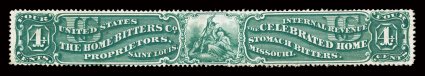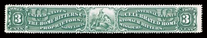 2154 O RS130b RS130b, The Home Bitters Co., 4c Green, silk paper, nicely centered, deep rich color, thin spot, very fine appearance.#RS130b, The Home Bitters Co., 4c Green, silk paper, nicely centered, deep rich color, thin spot, very fine appearance. (Image) $250.00