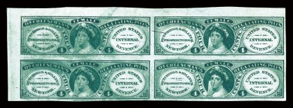 fine.#RS141b, Hutchings & Hillyer, 4c Green, silk paper, mint top left sheet-margin block of four, full margins all around, strong color and impression, large part o.g., extremely fine. (Image) for used $120.00+