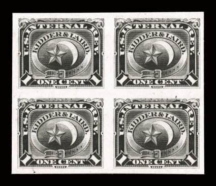 very fine.#RT12TC3, Kidder & Laird, 1c Black, trial color plate proof on India, mounted on white card, block of four, large margins all around, fresh color and sharp detailed impression, very fine. (Image) Est. $150-200