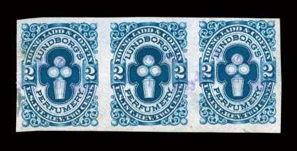cancelled by violet  handstamp, very fine.#RT28d, Young, Ladd & Coffin, 2c Blue, imperforate, watermarked, horizontal strip of three, full to mostly large margins all around, deep rich color and strong impression, cancelled by violet handstamp, very fine. (Image) $225.00