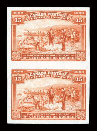 with gorgeous intensely rich colors characteristic of the first print#96a-103a, 1908 1/2c-20c Quebec Tercentenary, imperforate cplt., attractive set of matched vertical pairs all from the first printing, without gum as issued, marvelously fresh, with gorgeous intensely rich colors characteristic of the first printings, each with uniformly large margins, 1/2c and 20c with small thin spots, otherwise extremely fine; a very rare set as only 50 pairs of each without gum (first printing) and with gum were printed (Unitrade C$6,400.00). (imagea) (Image) $5,200.00