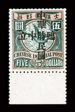 2320 og 145 145, 1912 Deep green and salmon, Nanking provisional, a visually striking mint example of the rarest of the Neutrality overprints, being a bottom sheet-margin single,