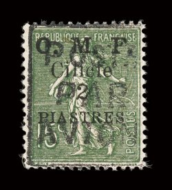 these extraordinarily rare air posts, of which only a small number we#C1-2, 1920 2pi on 15c Gray green and 5pi on 40c Red and gray air posts, strong colors, o.g., never hinged (gum just slightly brownish on the 15c), very fine; a handsome set of these extraordinarily rare air posts, of which only a small number were made, a still fewer are found in this premium never hinged condition; both signed Sanabria (Yvert #A1-2; for hinged €20,000). (imagea) (Image) for hinged $12,000.00