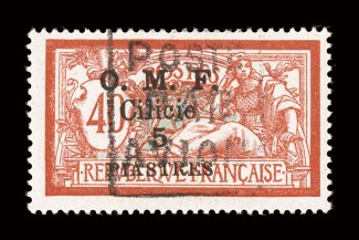is quite rare and only a small number of this variety exist signed Ca#22B var., 1919 1pi Ultramarine, without additional black overprint of Turkey, remarkably bright and fresh, excellent centering, o.g., trivial h.r., very fine; the basic stamp is quite rare and only a small number of this variety exist; signed Calves (Yvert #7a; €2,500). (Image) $1,500.00+