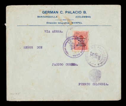 minor tears and light toned spots not affecting the stamp, fine 1980#C1, 1919 10c Rose air post, well centered single with intact perforations tied by the usual 18 June flight cancels on German C. Palacio B. imprinted cover, envelope with a few minor tears and light toned spots not affecting the stamp, fine; 1980 APS certificate. (Image) Est. $750-1,000