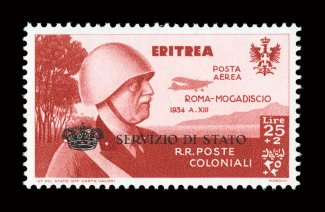 2386 og CBO1 CBO1, 1934 25L +2L Air post, with Servizio di Stato overprint, excellent centering, deep rich color, o.g., lightly higned, very fine (Sassone 1 Ç3,500).#CBO1, 1934 25L +2L Air post, with "Servizio di Stato" overprint, excellent centering, deep rich color, o.g., lightly higned, very fine (Sassone #1; €3,500). (Image) $2,800.00