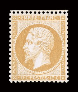 lignes), brilliant color, full fresh o.g. with just a trace of hin#42a var., 1870 10c Bister on yellowish, Ty. B, wonderfully fresh mint single, full well clear to large margins, in addition to which all four sides show rouletting (perces en lignes), brilliant color, full fresh o.g. with just a trace of hinging, very fine; the early imperforates were privately rouletted and are usually collected on piece or cover to establish authenticity, but mint examples exist making for a nice variety; catalog values are for the normal imperforate (Yvert #43B; €1,000). (Image) $1,000.00+