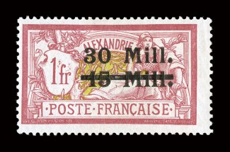2431 og 46A 46A, 1921 30m on 15m on 1Fr Claret and olive green, strong color, o.g., minor h.r., fine an especially elusive stamp signed Calves (Yvert 50 Ç1,200).#46A, 1921 30m on 15m on 1Fr Claret and olive green, strong color, o.g., minor h.r., fine; an especially elusive stamp; signed Calves (Yvert #50; €1,200). (Image) $1,100.00