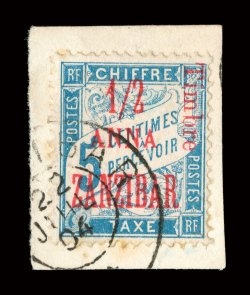 ex-Gibralter (Yvert 66 Ç1,400).#58, 1904 50c & 5a on 3a on 30c Lilac, tied to piece by a lightly struck c.d.s. at bottom, fresh color, nearly very fine; quite scarce and not known mint; 2000 Behr certificate; ex-Gibralter (Yvert #66; €1,400). (Image) $1,200.00